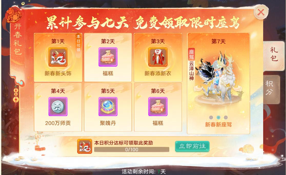1)活动期间每日可签到领取奖励,福糕,聚魄丹等豪礼送不停,完成3月4日签到必得迦楼罗王·天宫马倌!