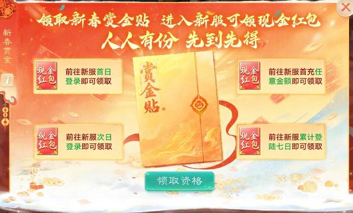 新春玩新服,新服送现金!进入新服,领取少侠你的新春现金红包。