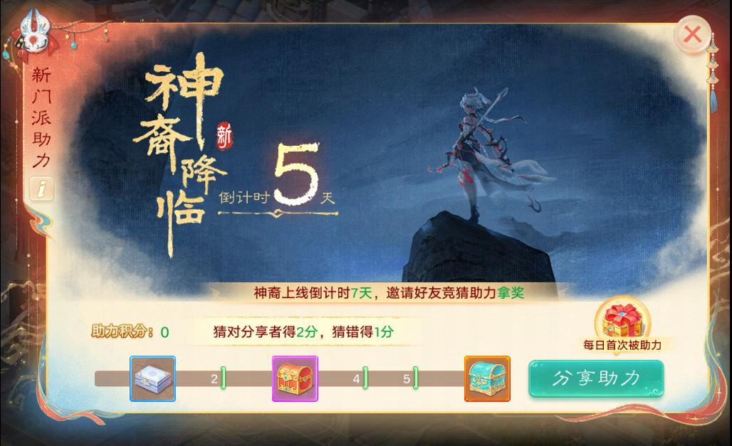 神裔上线倒计时,邀请好友竞猜,助力拿专属游戏礼包。参与活动,即有机会获得2级五行材料、高级金柳露、高级技能书等稀有奖励。
