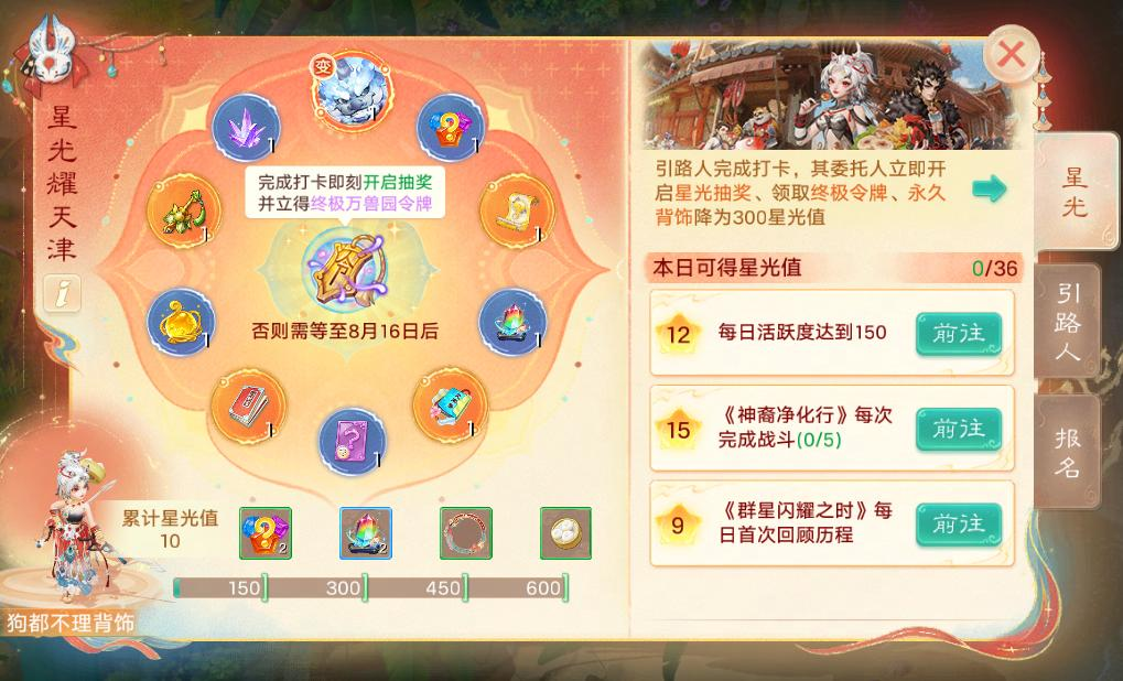2)“星光引路人”可携带“星光委托人”的星光前往天津嘉年华,完成线下打卡,完成打卡任务后,引路人与他的全部委托人都将获得以下权益:嘉年华永久背饰——狗都不理获取所需星光大幅降低(由累计600星光→300星光),星光抽奖活动打卡后提前开启,否则需至8月18日10:00方才开启抽奖。