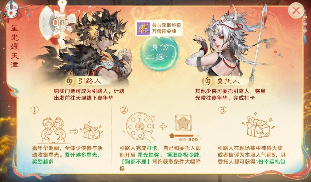 1)嘉年华期间,全体少侠将分为“星光引路人”与“星光委托人”两种身份,拥有线下嘉年华门票的少侠可在8月16日5:00前,主动申请成为“星光引路人”。同时,全体少侠都可成为“星光委托人”(引路人可获得丰厚的引路人专属奖励)。