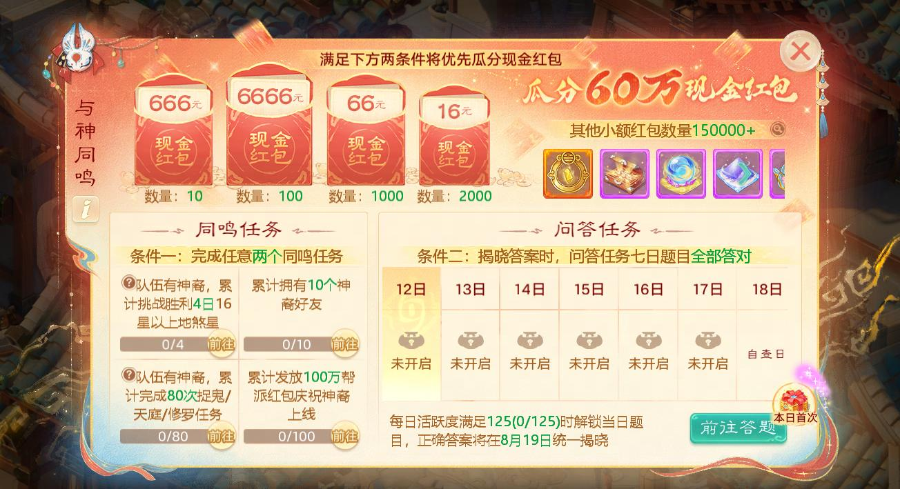 为庆祝新门派神裔上线,将送出60万现金红包(合计156480个)和大量稀有道具奖励。活动期间,每天解锁1-2道关于神裔的题目并全部答对,同时完成3个与神裔相关的成就任务,就可以在8月19日至8月21日期间领奖,参与瓜分60万现金红包!