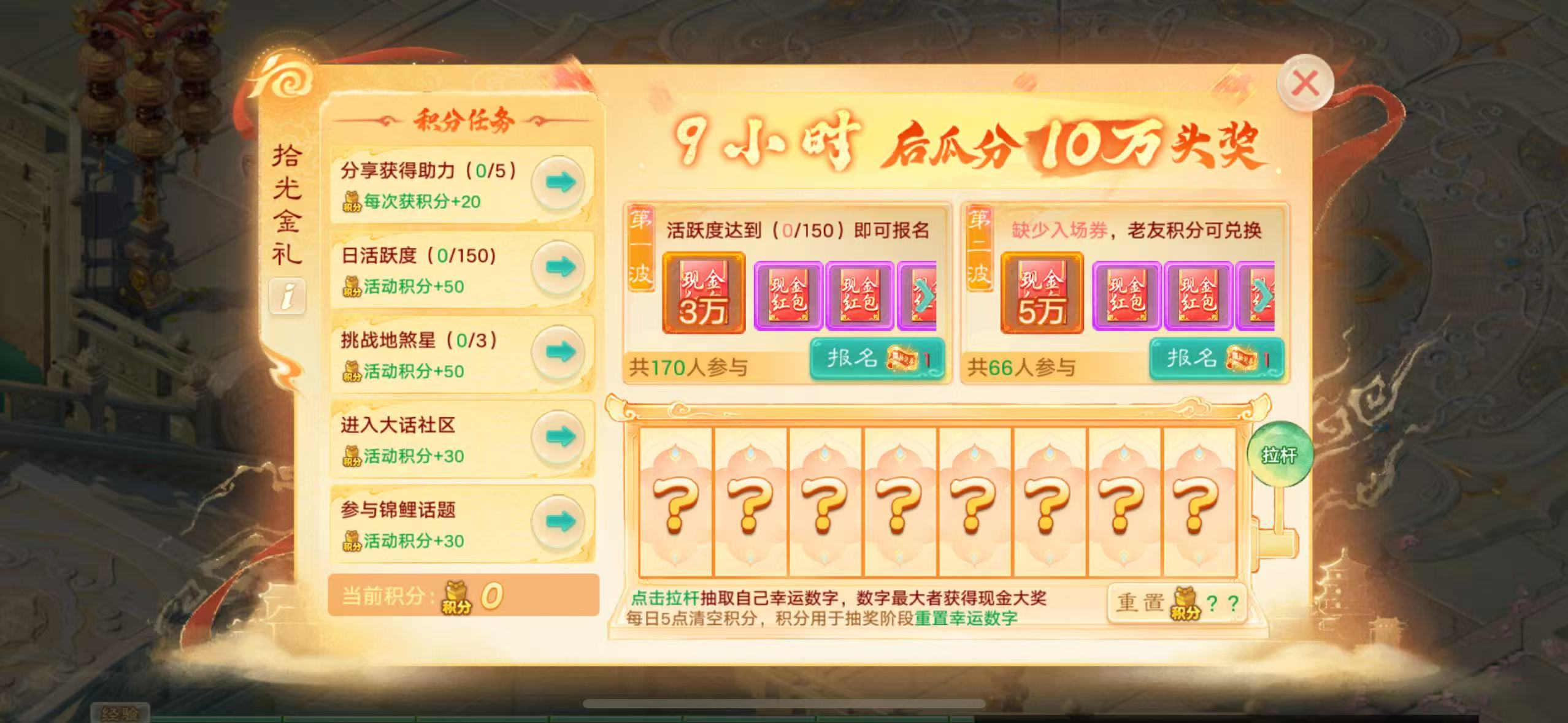 3)达到150活跃度,可以获得参与每天第一波奖池(3万大奖)的抽奖资格;