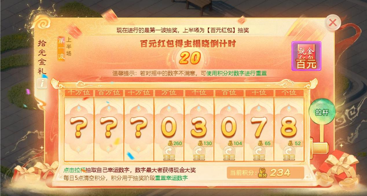 7)上半场5位数字抽出后,少侠可使用重置活动积分来重置不满意的数字;