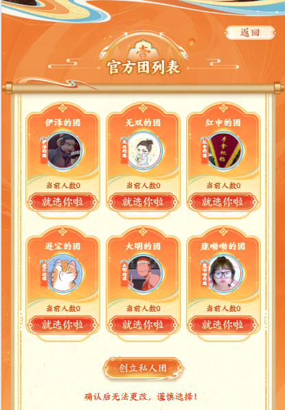 完成预创角后,您可以选择加入官方团或者自己创建团队成为团长。只要团队人数超100人,即可解锁全员现金红包奖。团队所有成员必得5元至100元不等金额的现金红包!