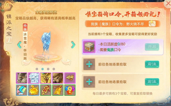 2)每天累计1/3/6分都可以领取阶段性奖励,有机会获得2级五行材料、高级金柳露、高级技能书等稀有奖励;
