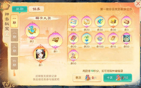 3)归阙夺珍,送高价值道具:回流少侠可使用归珍秘券参与抽奖,并可额外消耗对奖池进行加倍,抽取筋骨提气丸、高级凤羽精粹、高级藏宝图等惊喜大奖!