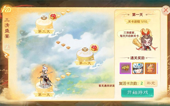 每日还可以参与三清盛宴小游戏,赢取1级五行材料、特殊召唤兽、超级福糕等丰厚奖励(完成逍遥无忧每天可额外合成2张复活卡);