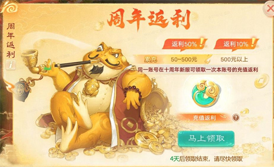 1)历史充值额度在50元及以上,则可以领取返利;(仅可在十周年系列服务器领取一次)