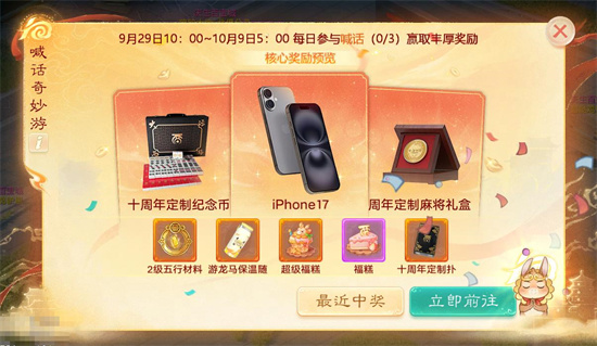 共庆十周年,喊话送iPhone17!十年大话,归来仍是少年! 上线喊出“鸡驴大神多多几率我!#25917”,即有机会赢取十周年定制麻将礼盒、纪念币、扑克牌、五叶玩偶、龙马水杯等海量游戏周边!更有福糕、超级福糕好礼放送,等你来拿!