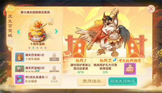 首次完整通关百宝城100%获得绑定福糕*1,完整通关百宝城累计一定次数100%获得《十周年主题家具套装》,包含十周年蛋糕、十周年纪念灯、纪念锦旗、大话灯牌等5件家具!