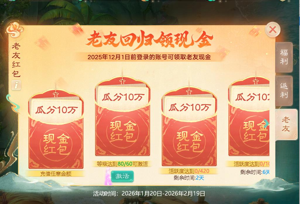 凡入驻本服的回流少侠(2025年12月1号后至今未登录游戏等级达到1转80级的账号),都可以在游戏中领取五个现金红包,金额1-10元不等! (先到先得,送完为止)