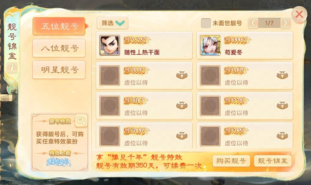 靓号卡盒可开出5位靓号信笺、8位靓号信笺、同角色编号靓号信笺、靓号残片,其中5位靓号信笺、8位靓号信笺均有机会开出限量50个全服唯一靓号,5位靓号信笺、8位靓号信笺可售卖(仅限仙玉)
