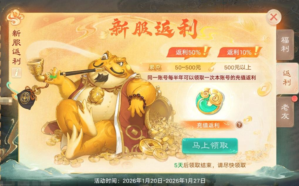 少侠可在本服领取2025下半年(7月1日-12月31日)的历史累计充值返利(仅能领取一次)